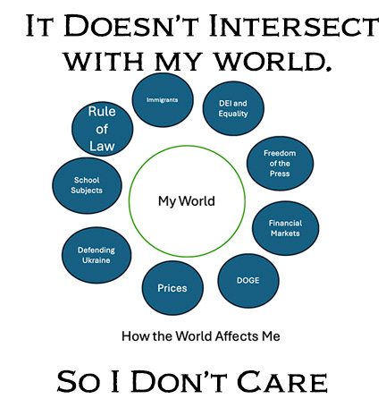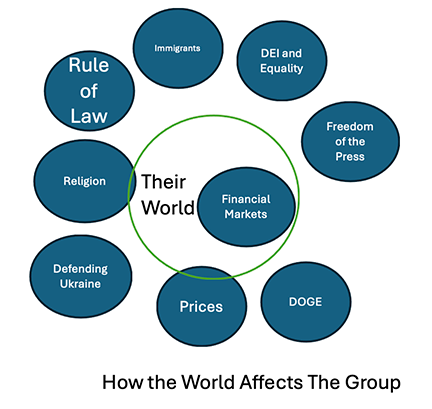 My case in point. I live in a rich area; I am on the working side of the populace, trying to find once again the financial security that I lost –that is an entirely different story for another time. But my background, my world, is made from seventy years of interactions with people and classes of all types, ages, races, fiscal status, political status, and affiliations. Hence, ‘My World' encompasses a wide breadth of social experience. I am influenced by that experience, which has raised my conscience and caring for others. Below is how ‘My World’ is affected by today’s events. I don’t have wealth, so prices are important to me, and the financial markets are not. I am not overly religious and am not immediately affected by someone’s immigration status just how they live, work and obey the law, so these issues have less influence on me. I have seen racial and sexual injustice up close and personal, and I am highly influenced by anything that takes away their rights and opportunities.